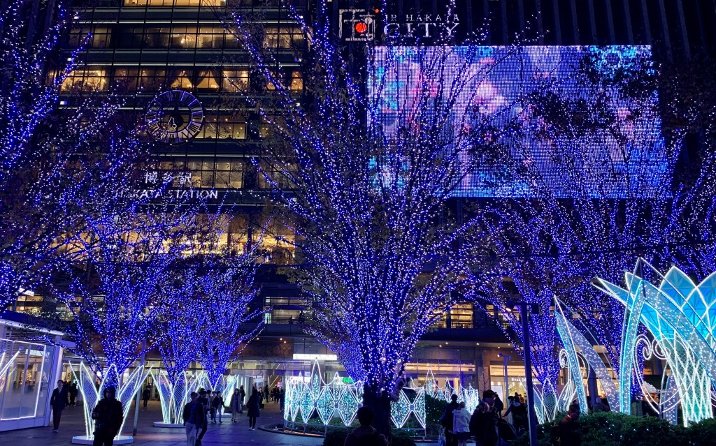 Booked in to the Hotel Nikko which was really nice. Upgraded our stay into a deluxe room for a discounted price (can’t beat a queen size bed to sleep on). After check in, we basically poked around the station area where they had a great (very) little xmas market. The lights and set up was really nice and provided a really cool atmosphere. Had my first Hakata ramen from a restaurant in the station complex. Throw in 6 gyoza dumplings and a thing called Mentaiko (pollock roe) and happy days are an understatement. Tracy was feeling a little ordinary so she went back and I had a little wander. Found a place called Canal City (a giant shopping mall) which had a water fountain show which was pretty cool. Tomorrow we stick around Fukuoka to give Tracy a chance to get back on her feet and then adventure time expands.